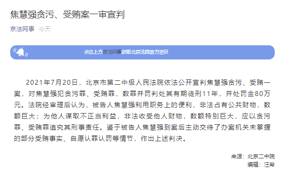 “京法网事”微信公众号消息,据北京二中院,2021年7月20日,北京市第二中级人民法院依法公开宣判焦慧强贪污、受贿一案,对焦慧强犯贪污罪、受贿罪,数罪并罚判处其有期徒刑11年,并处罚金80万元。法院经审理后认为,被告人焦慧强利用职务上的便利,非法占有公共财物,数额巨大;为他人谋取不正当利益,非法收受他人财物,数额特别巨大,应以贪污罪、受贿罪追究其刑事责任。鉴于被告人焦慧强到案后主动交待了办案机关未掌握的部分受贿事实、自愿认罪认罚等情节,作出上述判决。