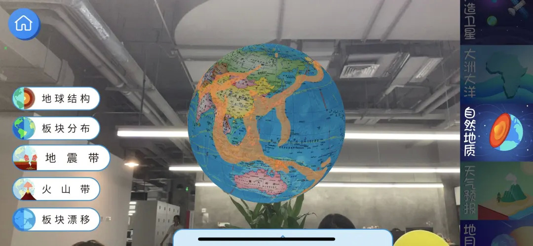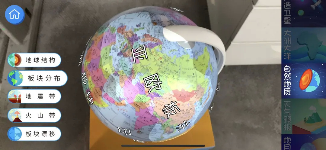 AR的功能比较简单。通过手机扫描,镜头中的地球仪就能显示出相应内容。不过,从镜头中,这些内容并不容易看清楚。因此,当继续转动地球仪,手机屏幕中就会显示出更清晰的内容。而且,并不会随着镜头挪动而改变。