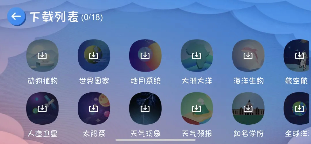 打开“北斗AR地球仪”,有18个素材可供下载,素材包大小在几兆到百兆之间。除了地球上存在的动植物、大洲大洋、天气、知名学府、洋流等等,甚至还能看太阳系、地月系统、人造卫星、航天飞机等等。