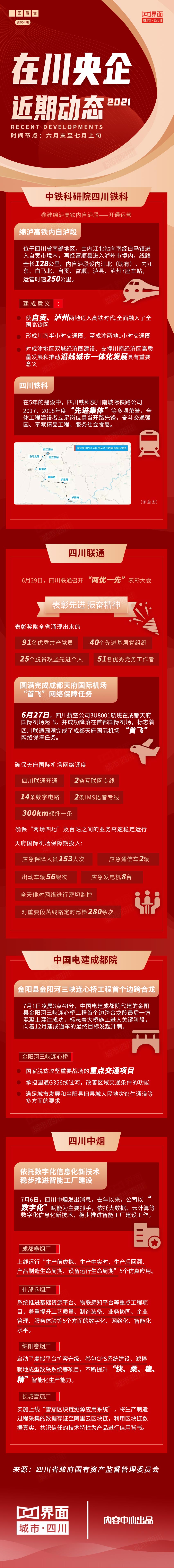 2021年6月末至7月上旬,中铁科研院四川铁科参建的绵泸高铁内自泸段开通运营;四川联通圆满完成成都天府国际机场 “首飞”网络保障任务;中国电建成都院代建的金阳县金阳河三峡连心桥工程首个边跨合龙段最后一方混凝土灌注成功;四川中烟发出消息,去年以来,公司以“数字化”赋能为主要抓手,依托大数据、云计算等数字化信息化新技术,稳步推进智能工厂建设工作。
