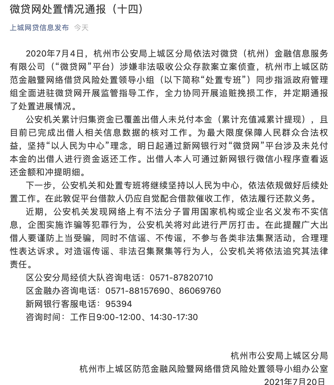 7月20日晚间, 杭州市公安局上城区分局发布《微贷网处置情况通报(十四)》。根据通报,公安机关目前已完成出借人相关信息数据的核对工作。明日(7月21日)起通过新网银行对“微贷网”平台涉及未兑付本金的出借人进行资金返还工作。