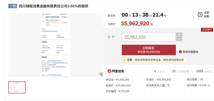标的物介绍显示,本次拍卖标的为锦程消金3.55%的股权,锦程消金注册资本为4.2亿元。结合注册资本来看,3.55%的股权约合1491万元,市值约3995.88万元,起拍价约当前市值的90%。截至发稿,本次拍卖有1089次围观,无人报名、竞买。