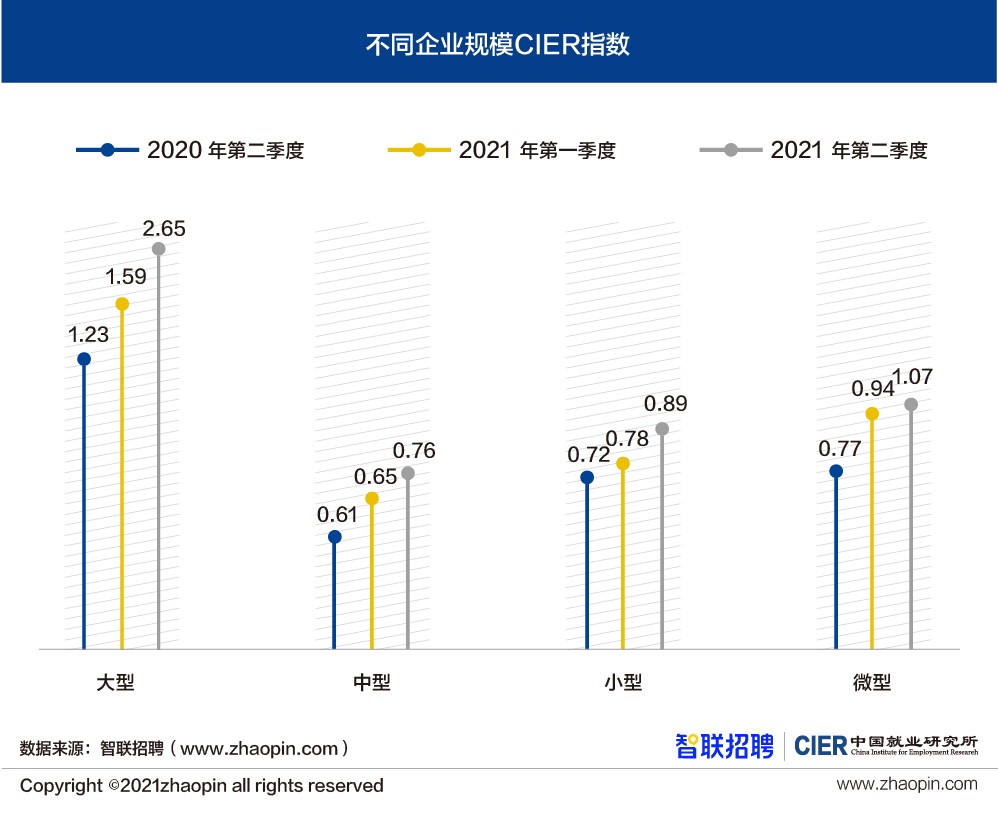 从企业规模来看,大型企业就业景气度显著好于中小微企业。二季度大型企业CIER指数为2.65,较一季度1.59大幅上升;中型、小型和微型企业CIER指数虽在恢复,但明显低于大型企业,中型和小型企业CIER指数甚至还小于1。