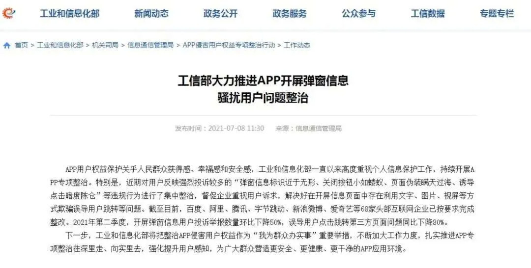 针对开屏广告的乱象,工信部近日发布整治公告,要求就APP开屏弹窗信息骚扰用户问题进行整顿,使其开屏广告的呈现形式符合《广告法》和《互联网广告管理暂行办法》。据公告中指出,目前,百度、阿里、腾讯、字节跳动、新浪微博、爱奇艺等68家头部互联网企业已按要求完成整改达,部分APP如淘宝、支付宝、饿了么、京东和拼多多等取消了开屏广告,应用点击即可秒开。下一步工信部将继续把整治APP侵害用户权益作为“我为群众办实事”重要举措。