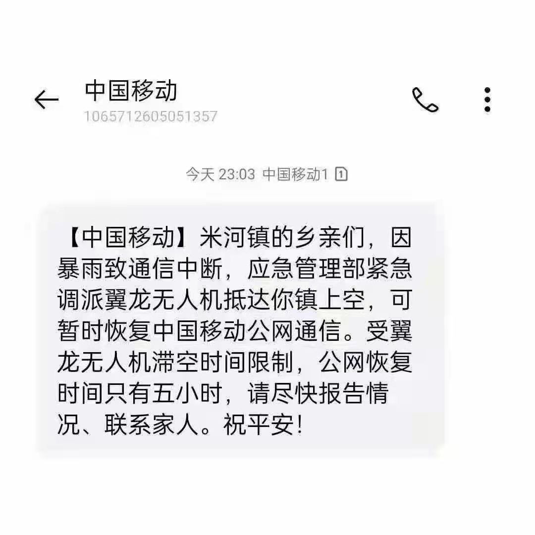 当晚米河镇用户收到了一条来自中国移动的短信——无人机将暂时恢复米河镇中国移动公网通信,恢复时间5小时,请尽快联系家人、报告情况。