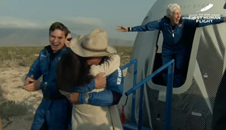 美国时间7月20日9点12分,世界首富杰夫·贝佐斯乘坐以“新谢泼德”命名的飞船,成功“打卡”卡门线(公认的外层空间起点),当太空舱到达107公里高度后,4名乘客欢呼起来,在随后3分多钟的失重翻滚体验后,飞行器稳稳降落到沙漠中。贝佐斯带着牛仔帽第一个走出来,和妻子激动拥抱在一起。