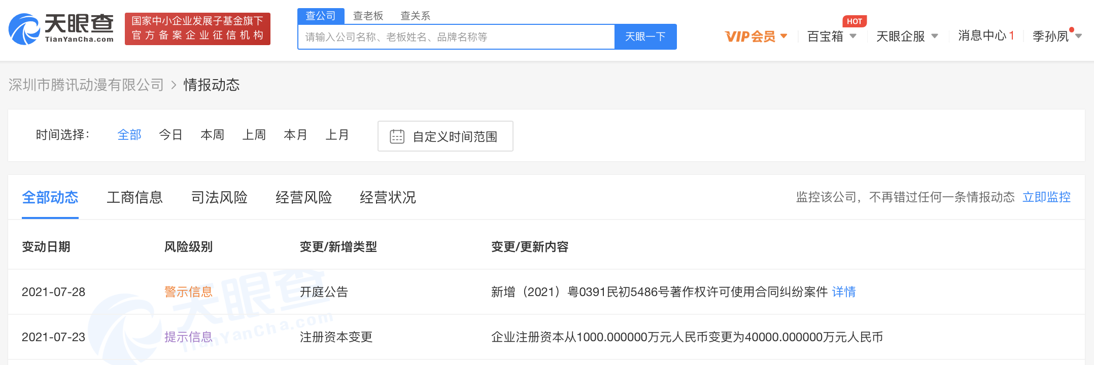 据天眼查APP显示,7月23日,深圳市腾讯动漫有限公司发生工商信息变更,注册资本由1000万人民币增至40000万人民币,增幅为3900%。