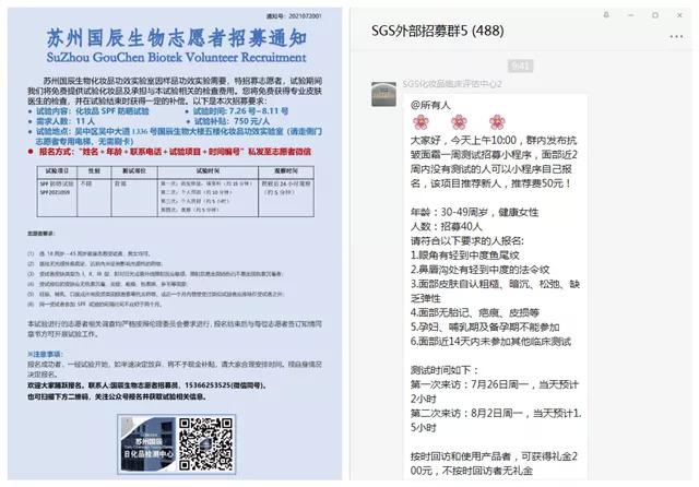 暨大医药中心发布的志愿者招募信息(左图),SGS化妆品临床评估中心发布的志愿者招募信息(右图)