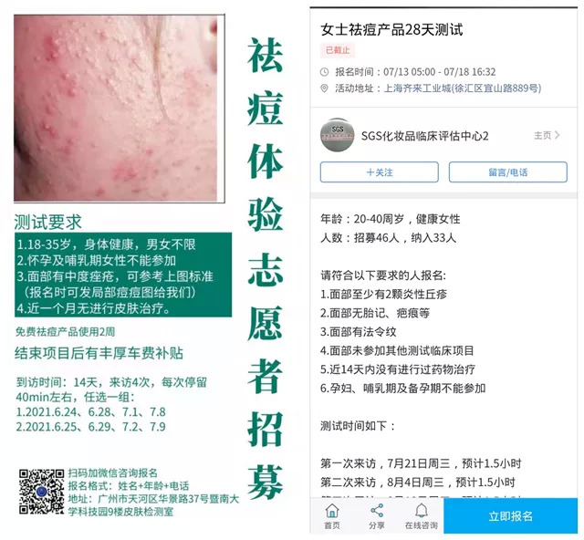 例如,暨大医药中心志愿者招募群中发布的祛痘功效检测项目的要求即包含了,18~35岁健康人士,男女不限;面部有中度痤疮,10颗痘痘以上(附带了可参考标准图)等;而SGS化妆品临床评估中心发布的一则“女士祛痘产品28天测试项目”中的要求则是“20-40周岁,健康女性;面部至少有2颗炎性丘疹;面部无胎记、疤痕等;面部有法令纹;面部未参加其他测试临床项目”等。
