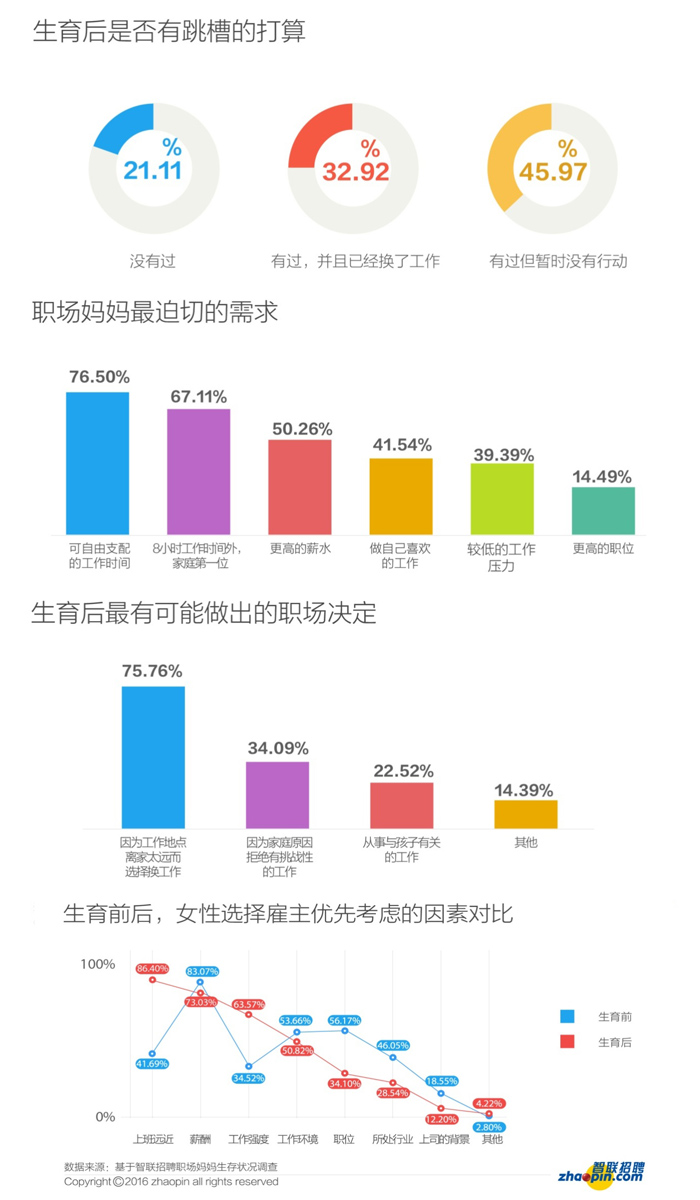 智联招聘于4月开展了“职场妈妈生存现状调查”,利用网络调查方式共回收有效问卷14290份。该调查从生育意愿、职业发展影响、全职妈妈态度等角度入手,分析“职场妈妈”这一特殊群体的职业现状。