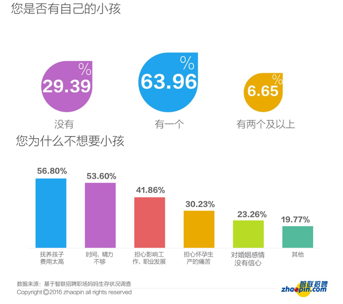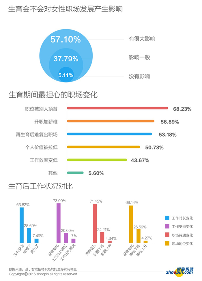 女性在职场中不时被划分为一个特殊群体来独立分析,归根结底是因为她们肩负着生育责任。虽然用人方表面上祝贺员工孕育新生命,但现实的算盘却让雇主笑不出来,毕竟一位怀孕生产的员工在没有贡献的情况下消耗着可观的用人成本,让企业对怀孕的员工不得不另眼相看。所以是“生”还是“升”不可避免地困扰着职场女性。这个母亲节,智联招聘发布《2016年职场妈妈生存状况调查报告》,统计生育究竟会给女性的职场发展带来多少影响?“职场妈妈”们内心的真实诉求是什么?