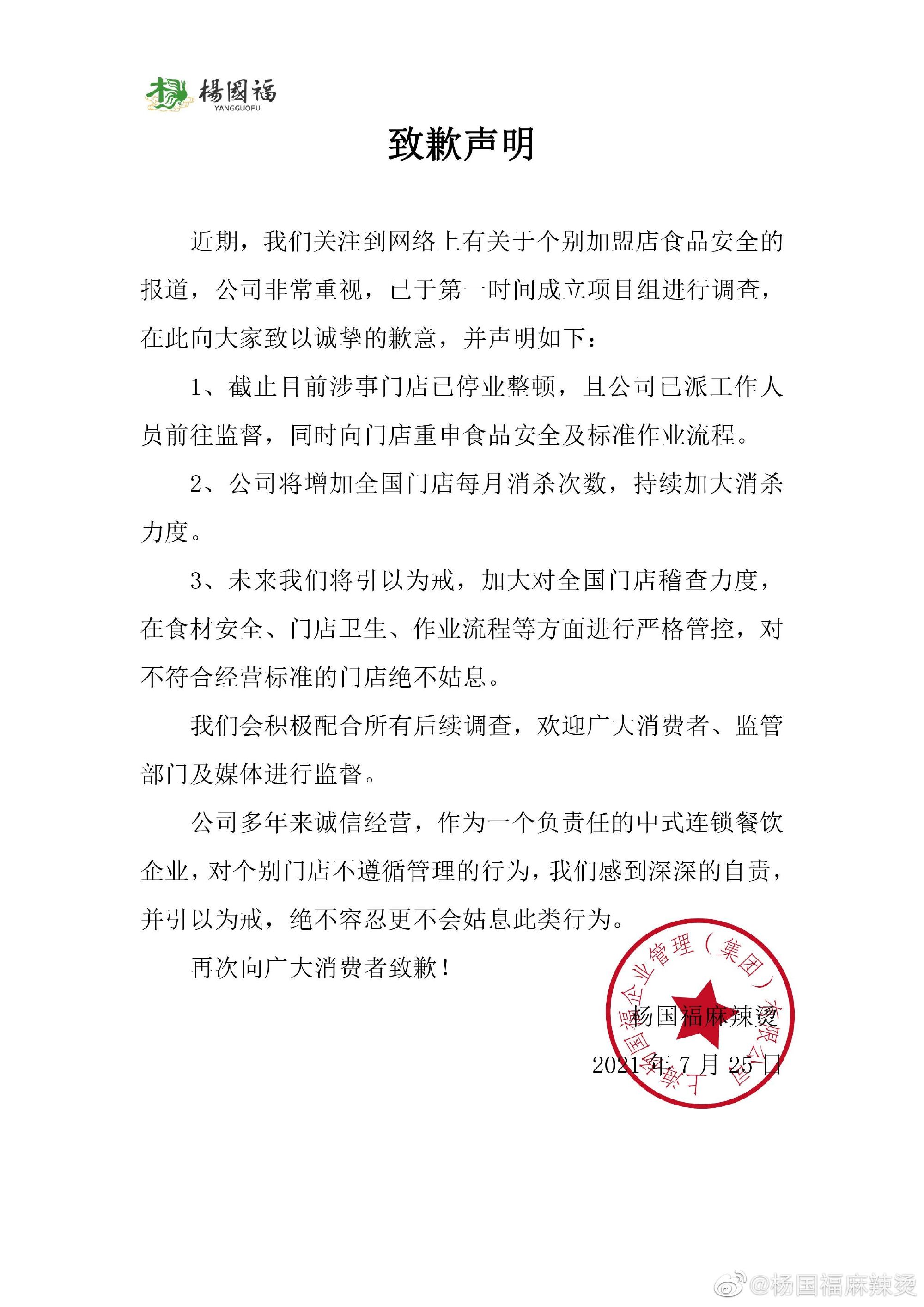 7月25日凌晨,@杨国福麻辣烫 发布致歉声明称,关注到网络上有关于个别加盟店食品安全的报道,公司已于第一时间成立项目组进行调查,截止目前涉事门店已停业整顿。未来将加大对全国门店的稽查力度,在食材安全、门店卫生、作业流程等方面进行严格管控。