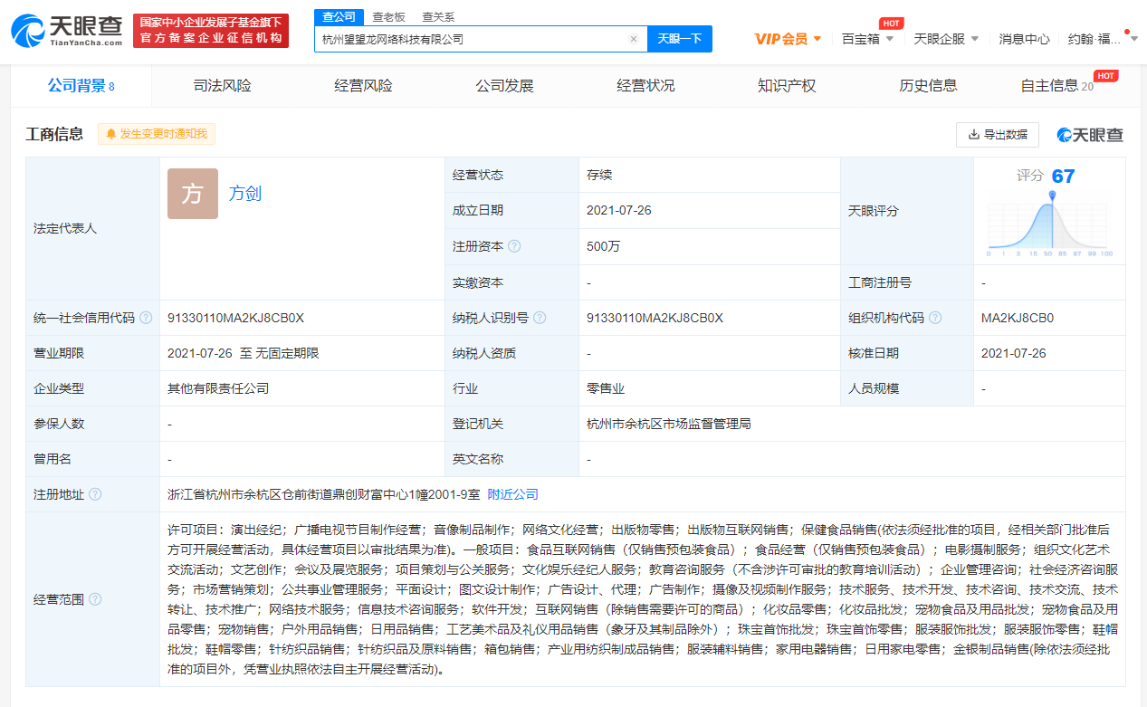 据天眼查APP显示,7月26日,杭州望望龙网络科技有限公司成立,注册资本500万,法定代表人为方剑,经营范围包括演出经纪;广播电视节目制作经营;组织文化艺术交流活动;文艺创作;文化娱乐经纪人服务等。股东信息显示,该公司由杭州遥望网络科技有限公司、刘震友、海南永恒星龙娱乐集团有限公司共同持股,黄子韬担任该公司的董事。