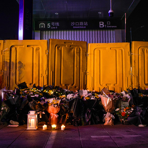 7月26日,河南郑州地铁5号线的沙口路站站前,可见人们从各地送来的鲜花,以悼念遇难者。现场陆陆续续能看到自行前往的送花者,或是将花束送至现场的外卖员。