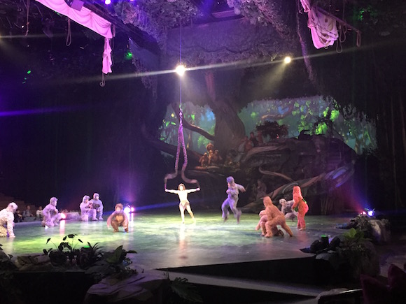 除了游乐设施,表演节目和巡游也是乐园的一大特色。在“探险岛”,观众们会发现“人猿泰山:丛林的呼唤”中有很多的中国杂技表演,通过声、光、电的渲染以及背景幕墙的展示,可以好好重温人猿泰山的故事。