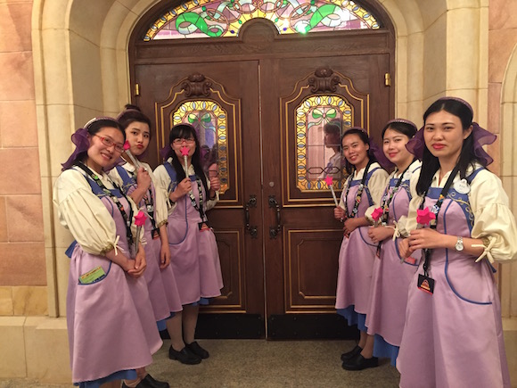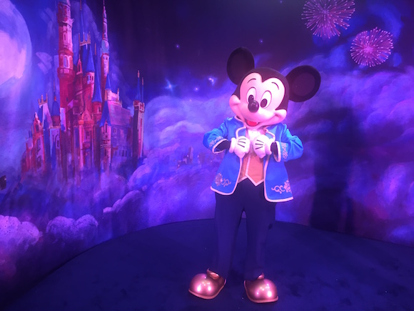 演职人员非常好客,一些有趣的互动还可能带来意外的东西。比如,当我在城堡内“缤纷变幻沙龙”的门口询问穿着服饰的演职人员是否是仙女教母的助手时,他们回答,“我们是见习仙女教母哦。”然后摆出了好看的姿势让我照相。而当我在“米奇俱乐部”内见到米奇的时候,我问了一句“我穿着维尼的衣服,你会生气吗?”米奇则给了我一个大大的拥抱。