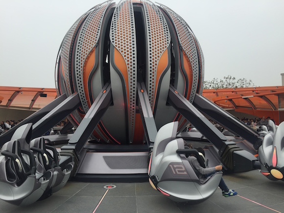 另一个大人们会喜欢的项目是“喷气背包飞行器”,这个项目来源于华特•迪士尼对于飞行器的热爱。喷气背包飞行器通过16个机器臂和1个巨型球体相连,游客两两一组,旋转的大球会把游客带到离地面几层楼的高度,而座位上的按钮可以在游玩过程中控制座位升降。