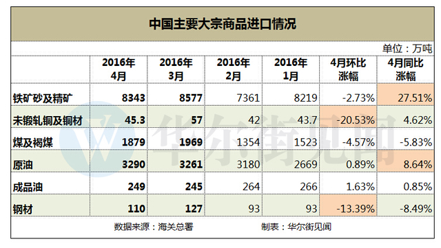 从同比来看,4月铁矿砂进口则增长27.51%,原油进口增长8.64%,未锻轧铜及铜材增长4.62%,煤进口下滑5.83%,钢材进口下滑8.49%。