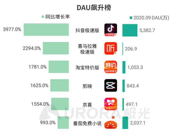 极光数据相关报告显示,移动互联网派生app发展迅速,2019年9月到2020年9月,抖音极速版等5款派生APP进入到季度内DAU飙升榜TOP 10。到2020年6月,极速版app覆盖渗透率达到42.9%,三年半时间增长近30倍。其中,老年用户占比较高,抖音极速版中46岁以上用户占比为14.8%,快手极速版中46岁以上的用户占比为12.4%。