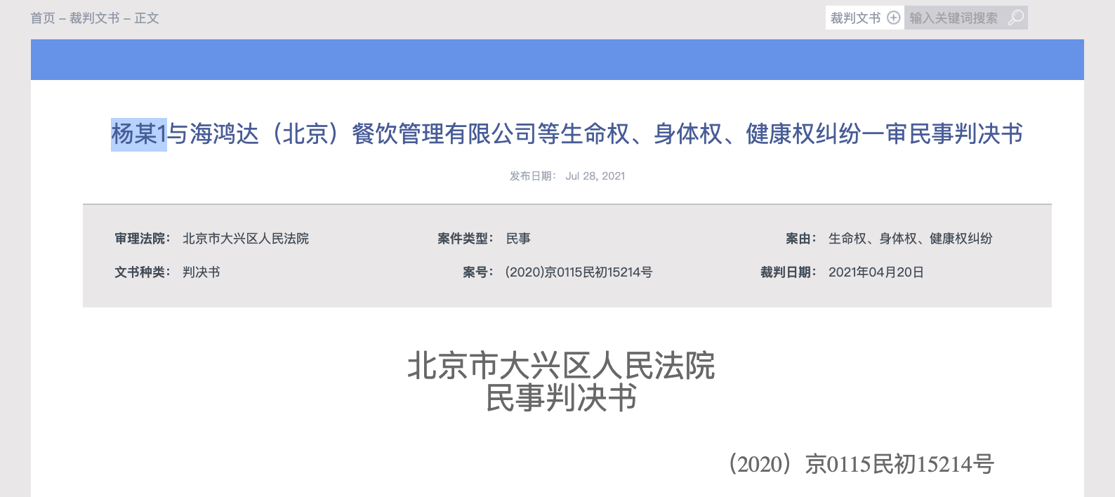 据天眼查APP显示,7月28日,北京法院审判信息网公开杨某1与海鸿达(北京)餐饮管理有限公司等生命权、身体权、健康权纠纷一审民事判决书,案号(2020)京0115民初15214号,审理法院为北京市大兴区人民法院。