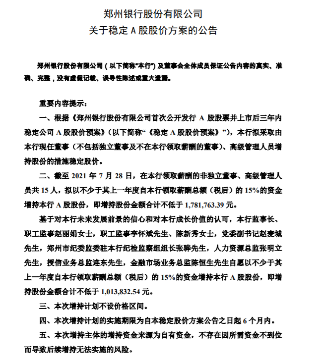 基于对本行未来发展前景的信心和对本行成长价值的认可,本行监事长、职工监事赵丽娟女士,职工监事李怀斌先生、陈新秀女士,党委副书记赵麦城先生,郑州市纪委监委驻本行纪检监察组组长张骅先生,人力资源总监张明立先生,授信业务总监连东先生,金融市场业务总监陈恒生先生自愿以不少于其上一年度自本行领取薪酬总额(税后)的15%的资金增持本行A股股份,即增持股份金额合计不低于101.38万元。