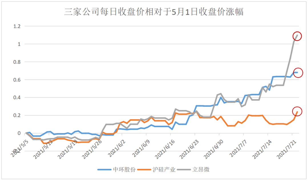 不过,中环股份和立昂微自5月以来股价涨幅逐渐与沪硅产业拉开差距。尤其立昂微近日股价一骑绝尘,连续三天涨停,创下新高,截至7月22日,立昂微涨幅与中环股份差了42个百分点,与沪硅产业则差了86个百分点。