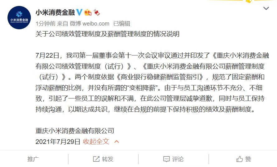 对于“变相降薪”小米消费金融进一步解释称,“由于与员工沟通环节不充分、不细致,引起了一些员工的误解和不满,在此公司管理层诚挚道歉,同时与员工保持持续沟通,以期达成共识,继续在合规的前提下保持积极的绩效及薪酬制度。”