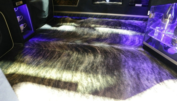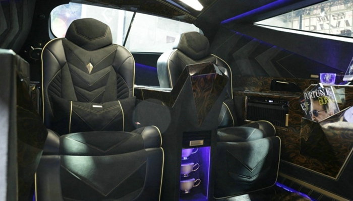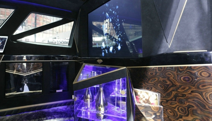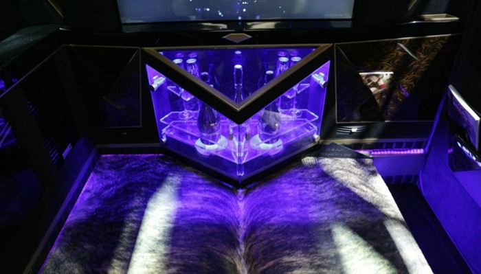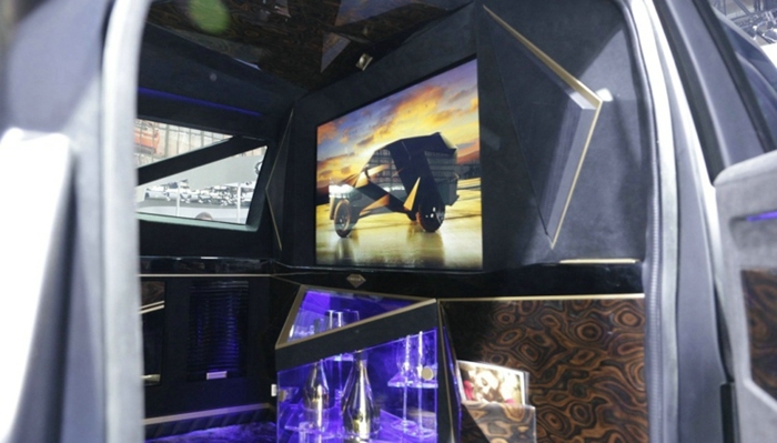 6. 界面瘾擎也在车展后第一时间拿到了卡尔曼内部的实拍图,作为一辆价格高昂的定制车辆,车厢内部的装潢肯定也是不惜成本的。卡尔曼的座舱采用了顶级会所包厢的装饰风格,车厢的正前方是一个液晶电视,电视下方是一个MINI吧台,地板铺装了高级的兽皮地毯,而门板和车顶则由实木和翻毛皮组成,车厢内部也充斥着各种三角形的元素,车窗、车顶、吧台、车门把手都是三角形设计。
