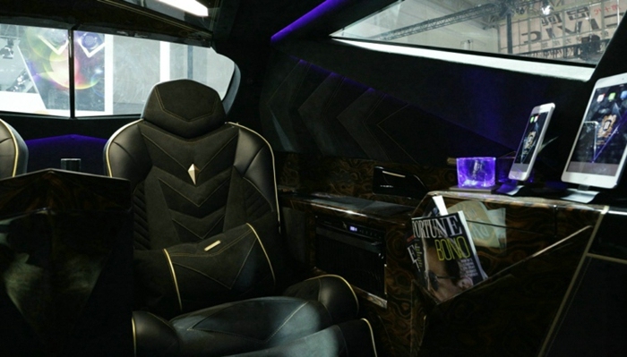 7. 车厢内设置了两张头等舱座椅,靠背的正中镶嵌着卡尔曼的logo,中央扶手的下方是一个存放咖啡杯的储物柜,座椅的左右两侧是空调出风口和木质杂志架,两侧车窗下沿左也设置了扶手台,宽大的台面上设计了放置酒杯和给iPhone和iPad充电的专用插座,人性化方面考虑的还是比较周到的。整个座舱内部辅以幽兰色的氛围灯,灯管效很夜店范儿,非常迷人。