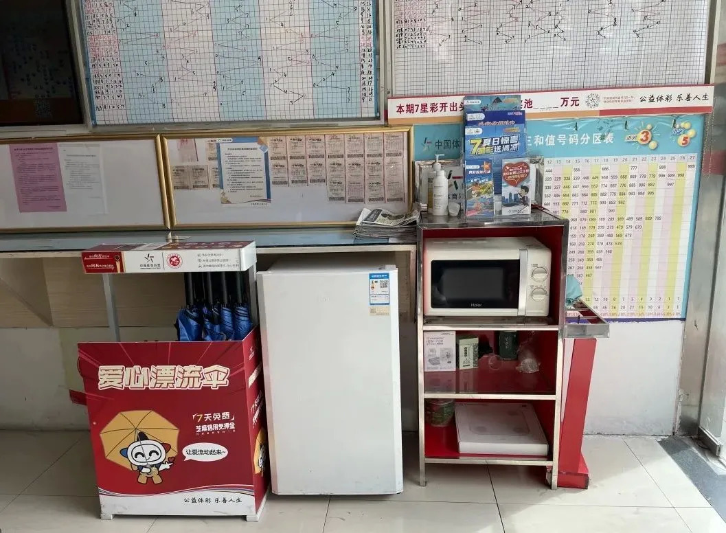 位于鄞州区潘火街道启明路818号的3302119536体彩实体店是首批安装爱心漂流伞服务设备的实体店,代销者鲍米来说,赠人玫瑰手有余香,能多为市民做一些力所能及的事,他觉得特别自豪。除了销售彩票,实体店还能让户外工作者和每一位路过的朋友坐一坐,歇一歇,寒天有热饭菜,雨天有爱心伞。