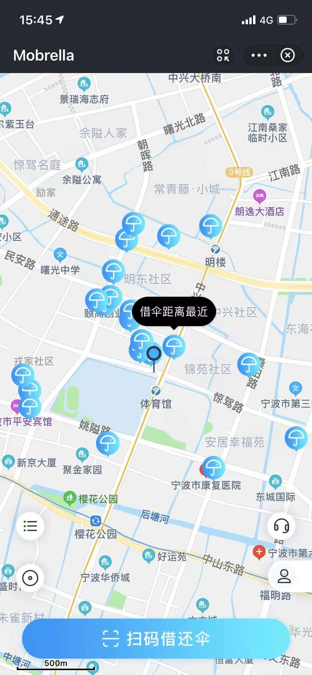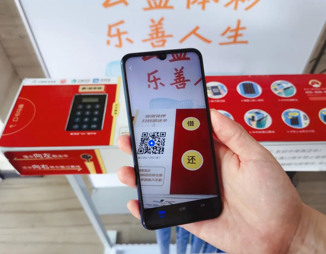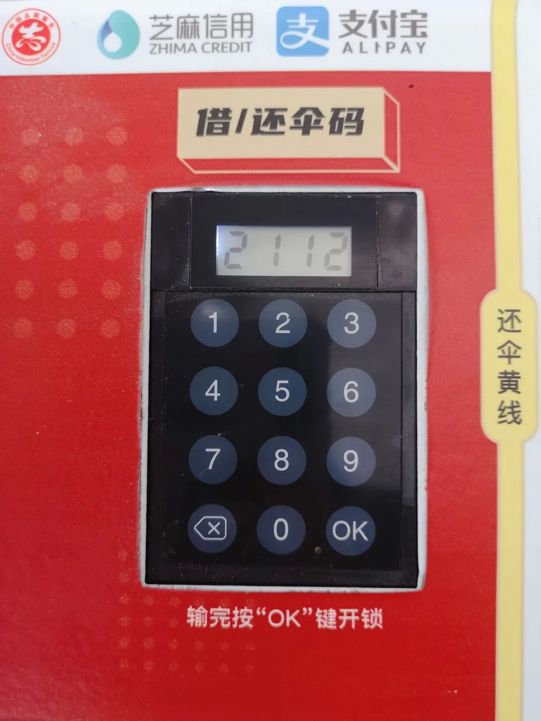 打开手机支付宝扫描伞桩上的二维码,点击【立即借伞】,芝麻信用550,可以免押金借伞噢!