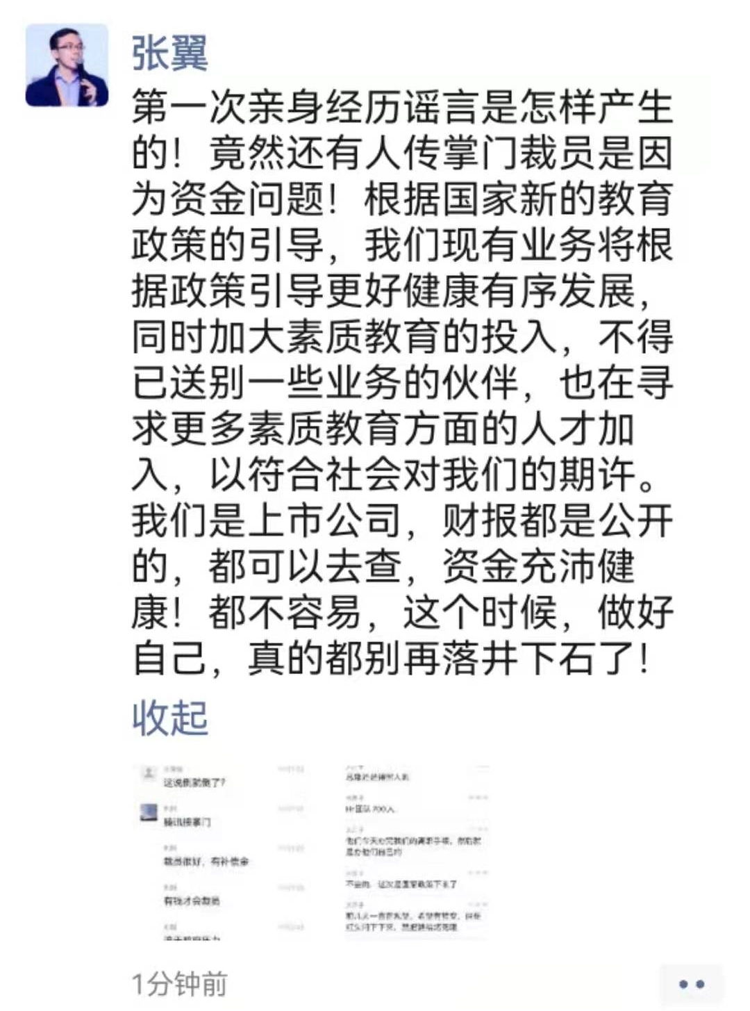掌门CEO张翼当晚在朋友圈写道:“根据国家新的教育政策的引导,我们现有业务将根据政策引导更好健康有序发展,同时加大素质教育的投入,不得已送别一些业务的伙伴,也在寻求更多素质教育方面的人才加入,以符合社会对我们的期许。”