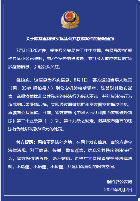 “平安南阳”微信公众号8月2日消息,桐柏县公安局今日通报,7月31日,有网民发布“桐柏县某小区已被封,有两个发热的被拉走,103人被拉去检测”等涉疫情信息,引起公众关注。经核实,该信息为不实信息。