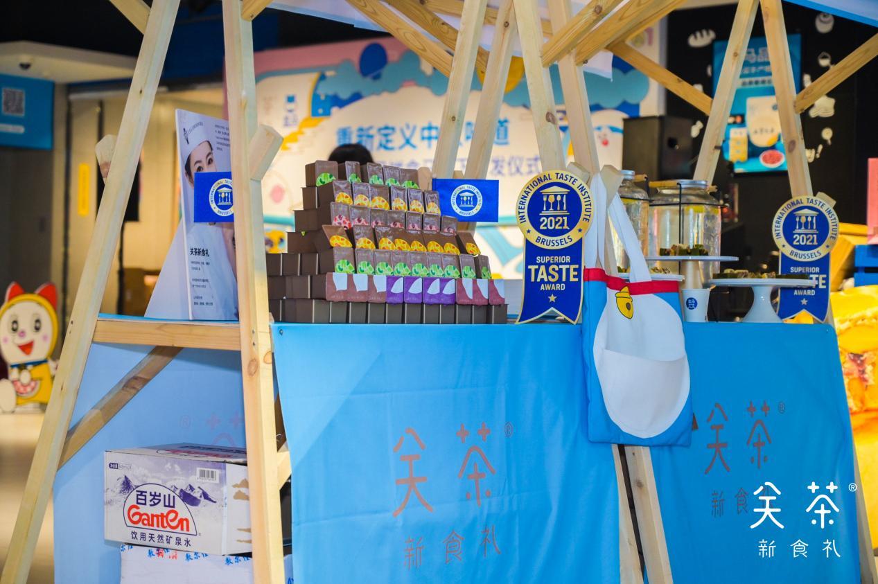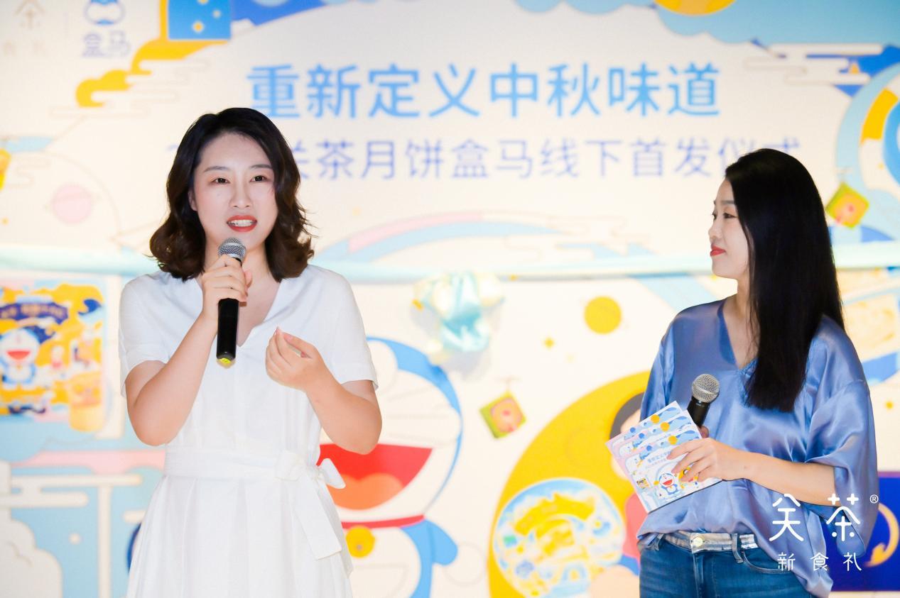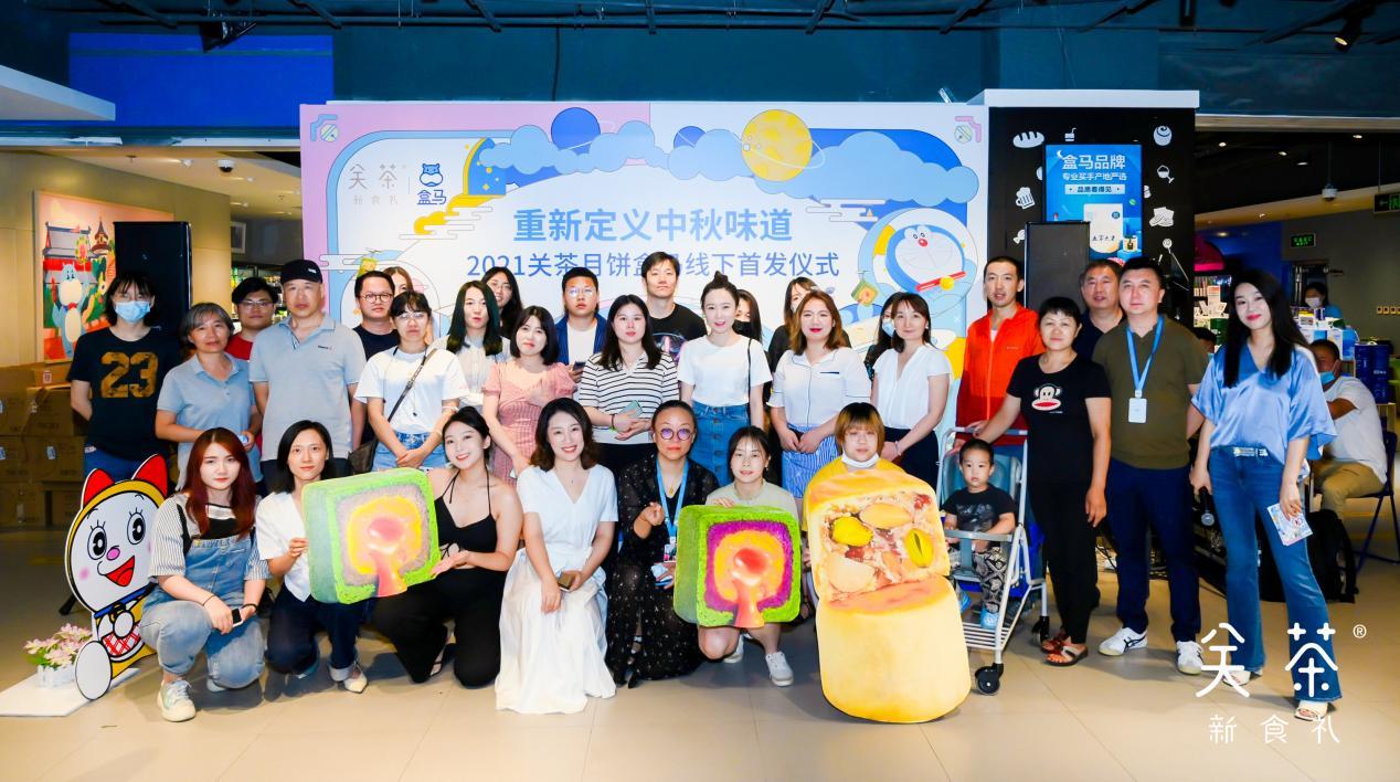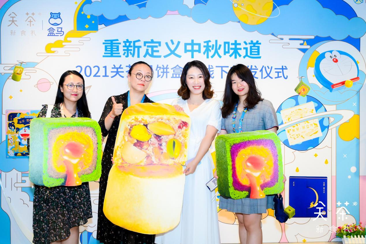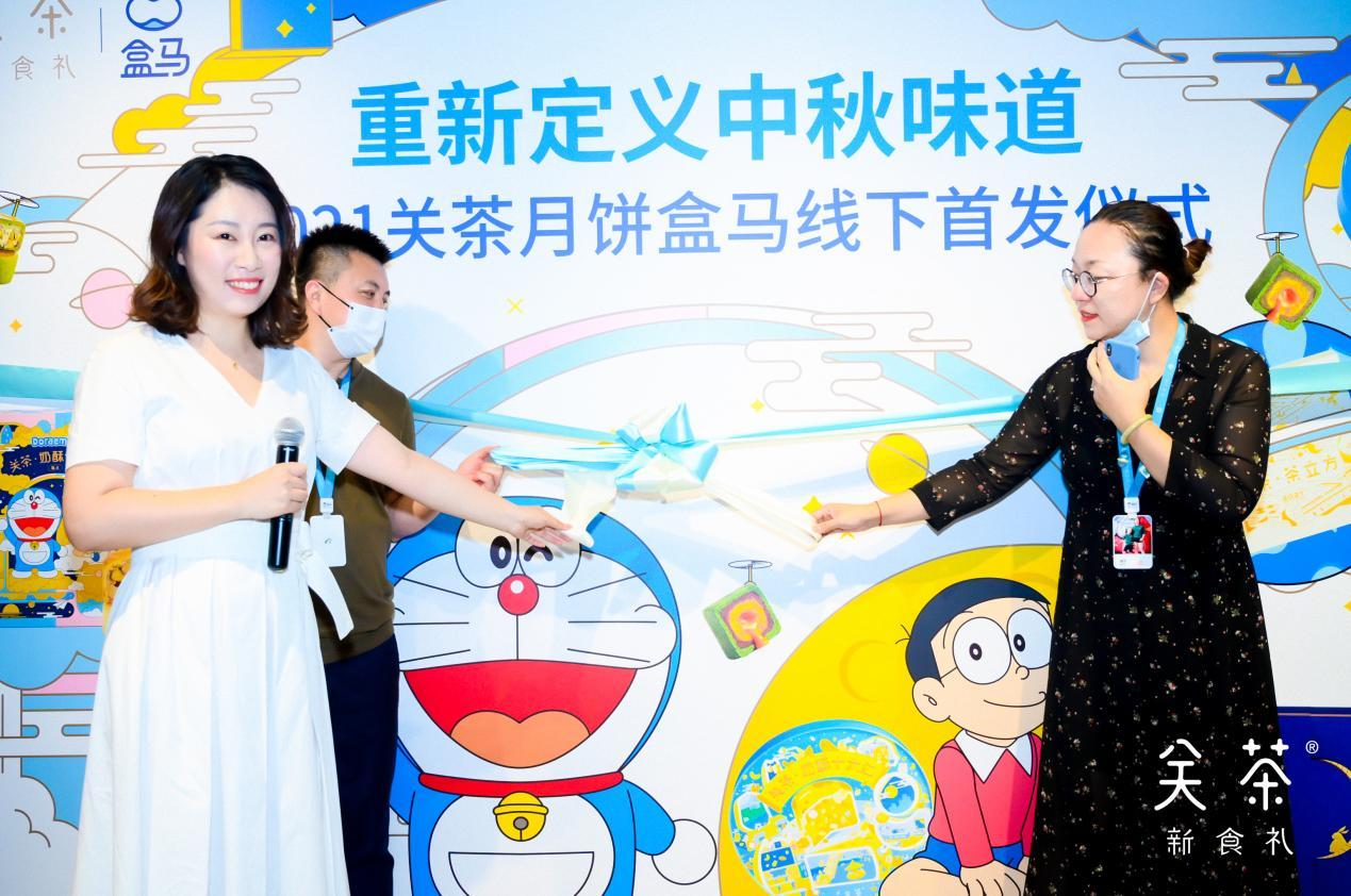7月27日,关茶新食礼品牌于北京盒马鲜生世纪财富中心店(国贸店)举行2021中秋月饼线下渠道首发仪式。仪式上,关茶新食礼携手哆啦A梦推出2021中秋限定月饼——奶酥十六仁和茶立方,首次登陆盒马鲜生(下简称“盒马”)。
