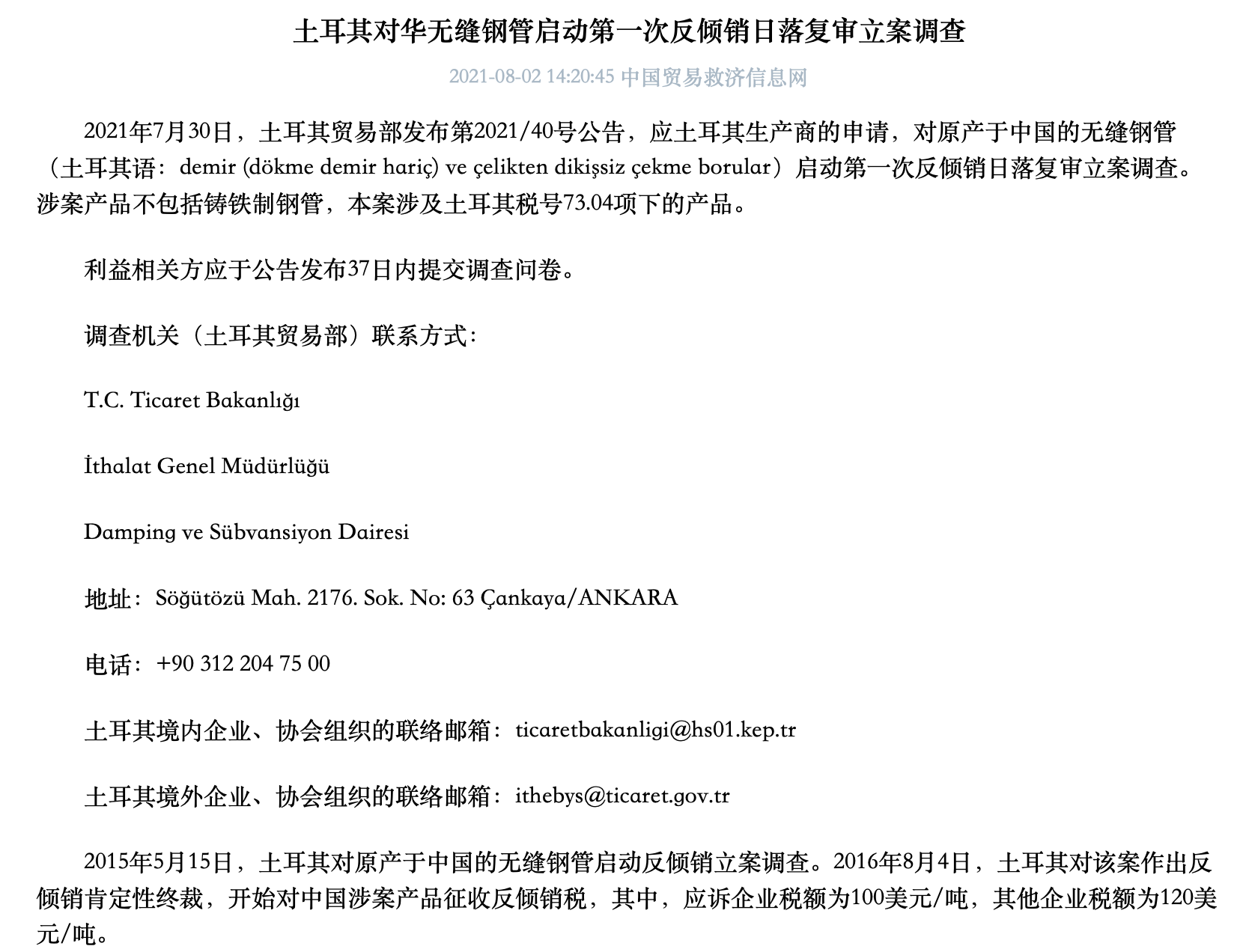 2015年5月15日,土耳其对原产于中国的无缝钢管启动反倾销立案调查。2016年8月4日,土耳其对该案作出反倾销肯定性终裁,开始对中国涉案产品征收反倾销税,其中,应诉企业税额为100美元/吨,其他企业税额为120美元/吨。
