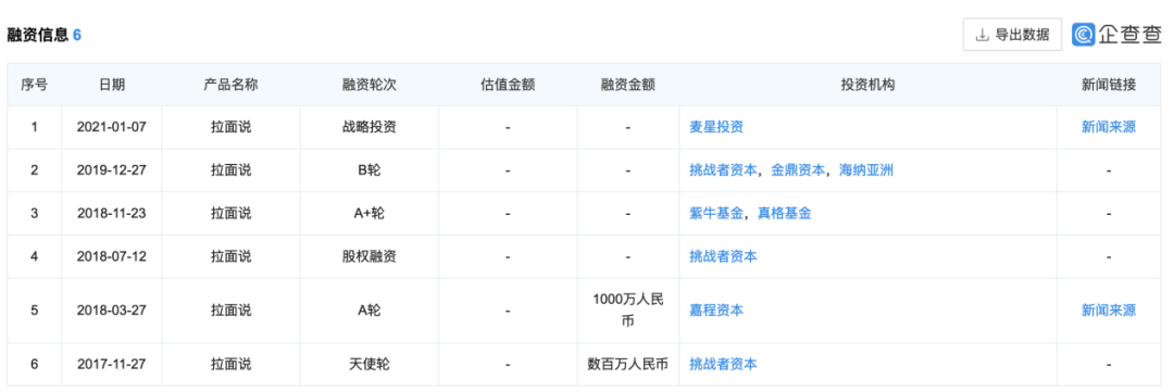 2021年7月,寻味狮宣布完成数千万元天使轮融资,由源码资本和天图资本联合领头完成。据了解,该轮融资金额将用于品类扩充和渠道推广,预计未来一年实现1亿元营业收入;而早在2021年3月,专注中华制面的劲面堂获得千万融资,且在一年不到的时间里,其已经连续完成三轮千万融资;同样的,据企查查显示,拉面说也已与1月初完成第6轮融资。