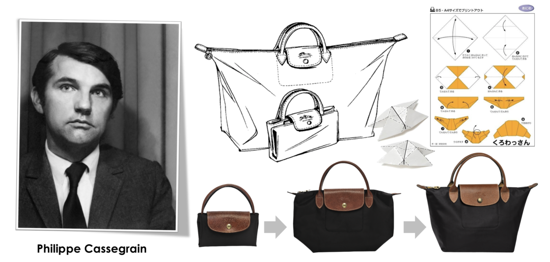 90年代初,身为家族第二代管理者的 Philippe Cassegrain 在一次去日本旅行的过程中发现了当地的剪纸艺术,回到法国后,他根据自己对日本剪纸艺术的理解,辅以尼龙和皮革材质,设计出了首个 Le Pliage 手袋。