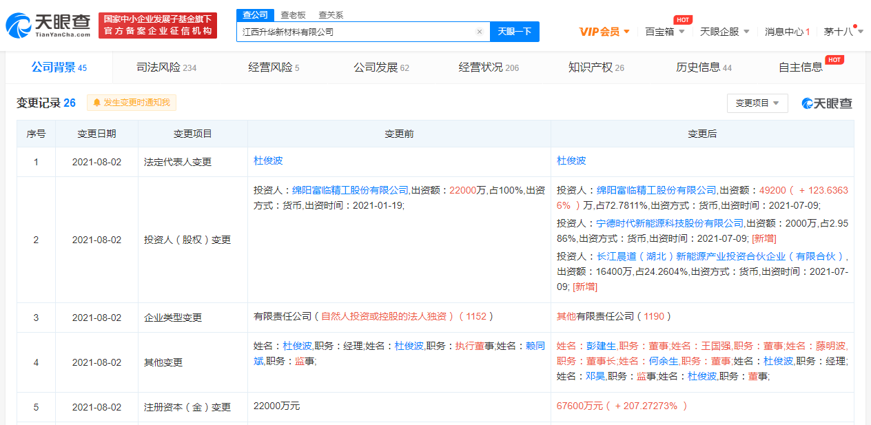 据天眼查APP显示,8月2日,江西升华新材料有限公司发生多项工商变更,新增股东宁德时代新能源科技股份有限公司等;同时注册资本由2.2亿人民币增至6.76亿人民币,增幅超207%。