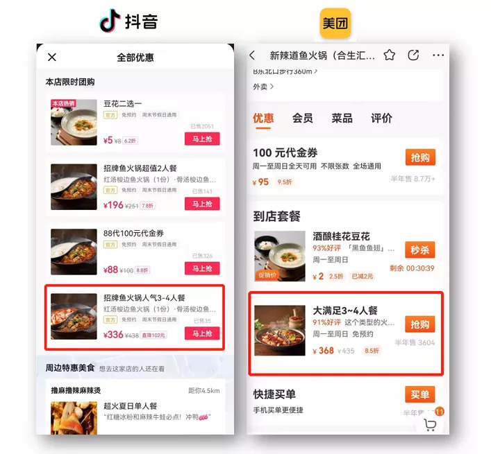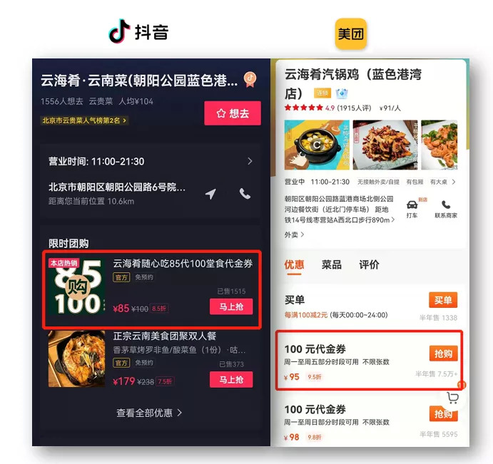 目前,在开通了“抖音团购”的餐饮商家身上,我们已经可以看到这种倾向性。以新辣道和云海肴为例,两个商家在“抖音团购”上线的产品中,不论是套餐价格、种类还是抵用券的面额,均优于其他平台。