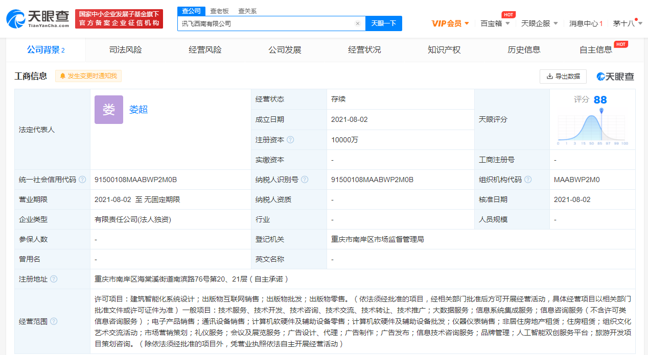 据天眼查APP显示,8月2日,讯飞西南有限公司成立,注册资本1亿元,法定代表人为娄超,经营范围包括大数据服务;信息系统集成服务;建筑智能化系统设计等。股东信息显示,该公司由科大讯飞股份有限公司全资控股。