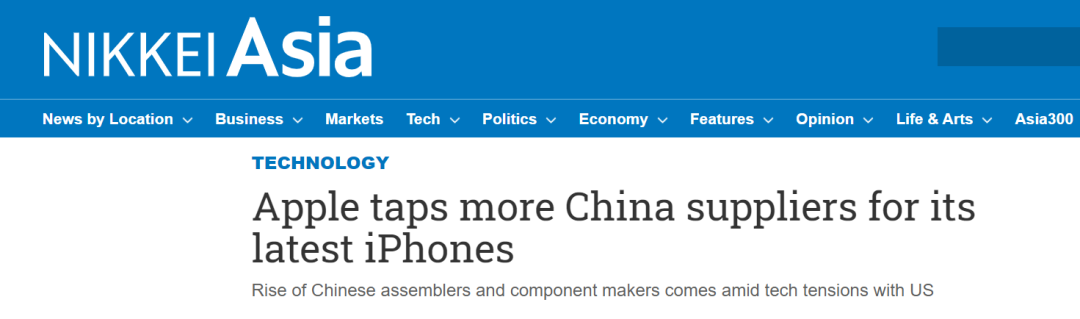 《日经亚洲》也认为,苹果采用更多中国供应商的举措,也反映了中国科技企业竞争力的提升。