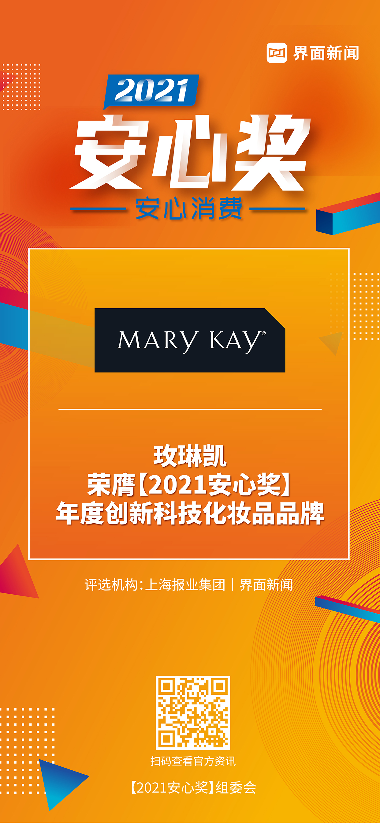 8月5日,上海报业集团|界面新闻在上海静安瑞吉酒店举办了【2021安心奖】颁奖典礼,并正式公布了本年度获奖名单。围绕“安心消费”这一核心价值,来自生活服务、家电、家化、美妆护肤、食品、乳品、饮品等领域优秀企业,突破重围,斩获年度大奖Top40。玫琳凯凭借其始终如一的创新理念,荣膺年度创新科技化妆品品牌。