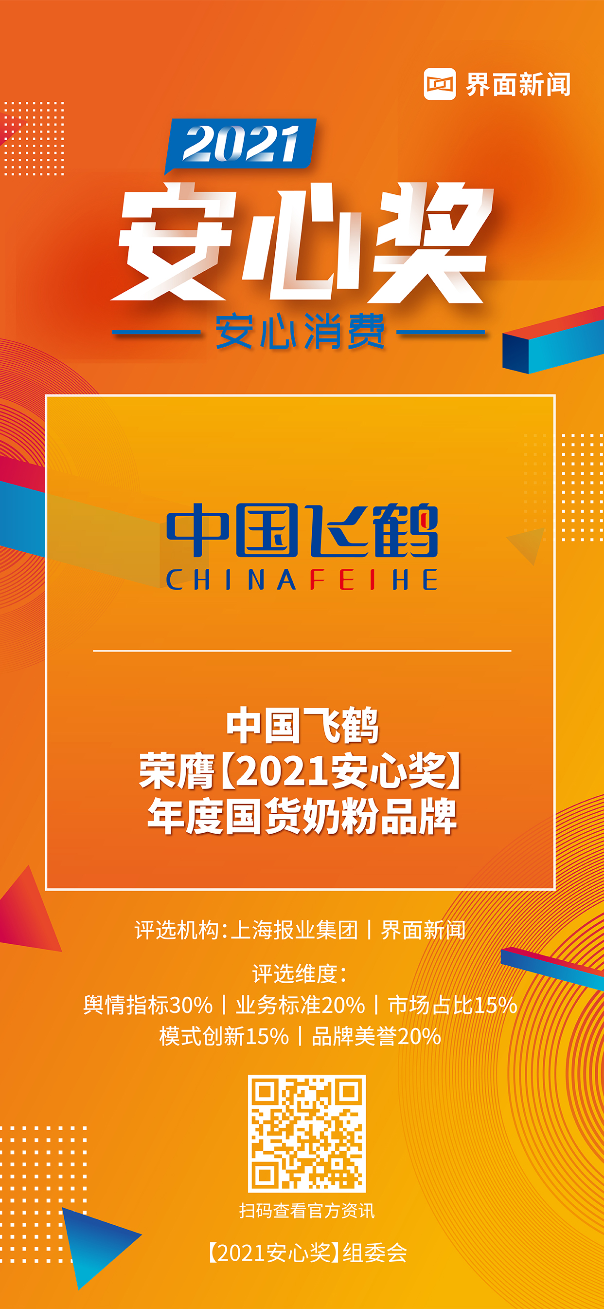 8月5日,上海报业集团|界面新闻在上海静安瑞吉酒店举办了【2021安心奖】颁奖典礼,并正式公布了本年度获奖名单。围绕“安心消费”这一核心价值,来自生活服务、家电、家化、美妆护肤、食品、乳品、饮品等领域优秀企业,突破重围,斩获年度大奖Top40。中国飞鹤凭借其创新的坚守和对安全的承诺,荣膺年度国货奶粉品牌大奖。