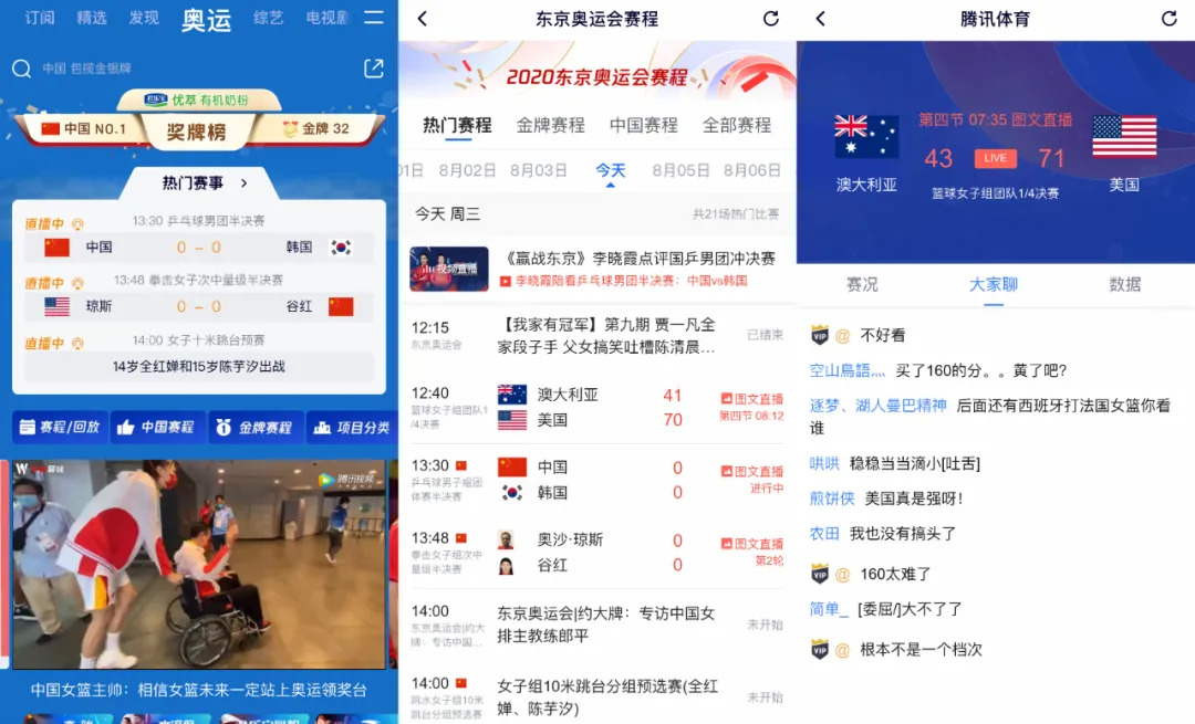 腾讯的优势在于多平台、多业务联动。然而,腾讯面临最大的问题是,转播权对赛事的延迟——长达2个小时。这意味着,线上观众选择腾讯的优先权大大降低。观众首选通过咪咕视频、央视频看完了直播,或者已经在微博、各大新闻资讯APP第一时间知晓了各大重点赛事结果。
