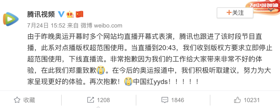 第二天,腾讯视频道歉。说辞是开幕式“多个网站均直播”。买版权的初衷是为了保护版权方的利益。版权方也出现侵权,着实让人迷惑。