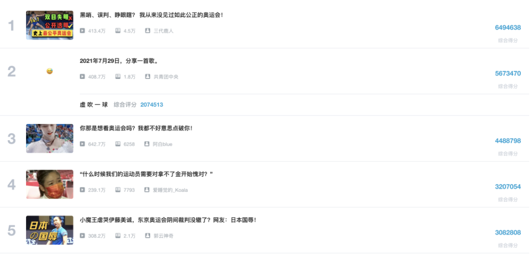 截止7月31日,B站全站排名前五的视频都与东京奥运会相关,除了@共青团中央 未添加任何画面黑屏“分享一首歌”外,其他视频均有对现场直播内容的剪辑,进行“二次创作”。