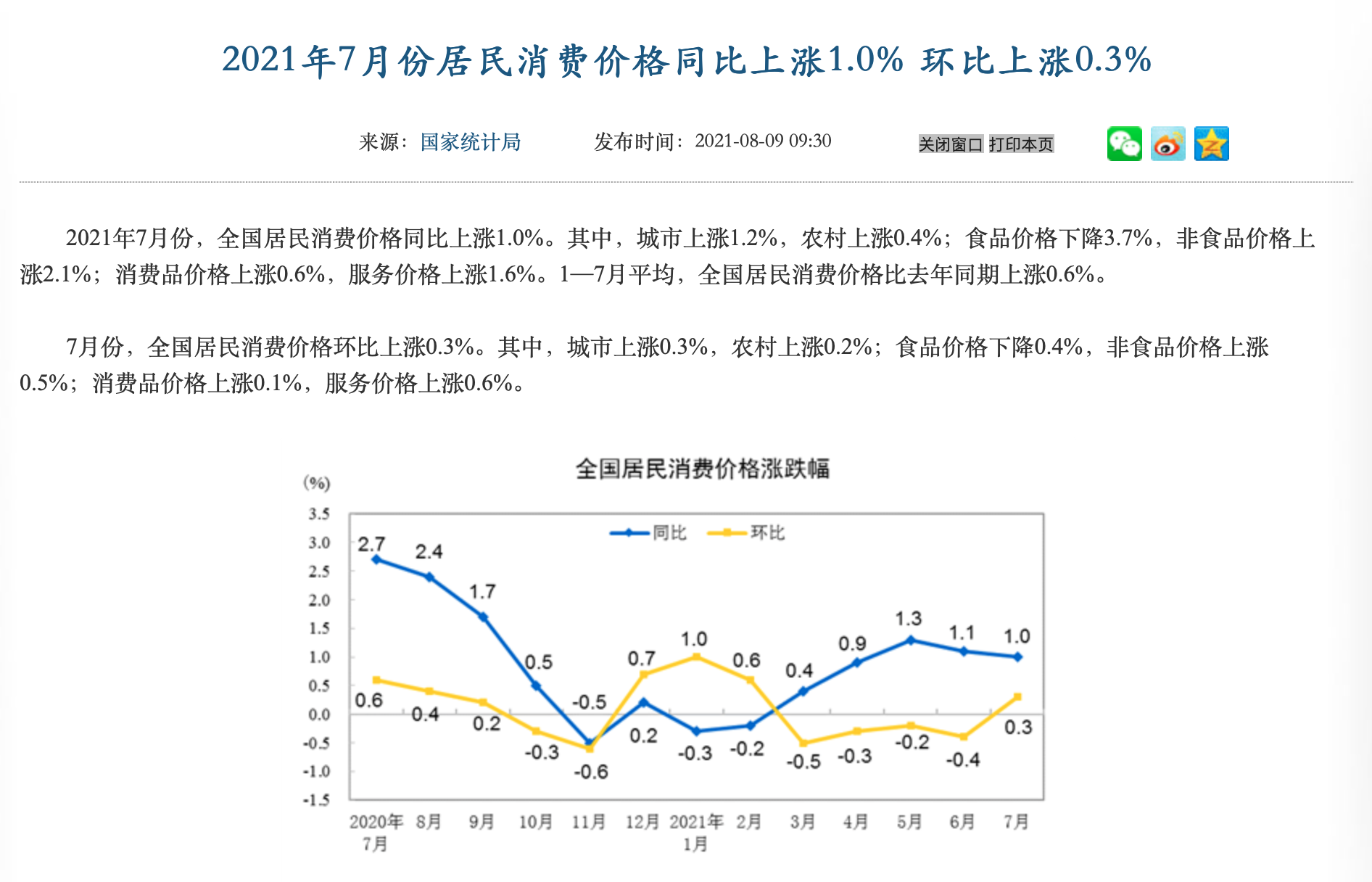 据国家统计局网站消息,2021年7月份,全国居民消费价格同比上涨1.0%。其中,城市上涨1.2%,农村上涨0.4%;食品价格下降3.7%,非食品价格上涨2.1%;消费品价格上涨0.6%,服务价格上涨1.6%。1-7月平均,全国居民消费价格比去年同期上涨0.6%。