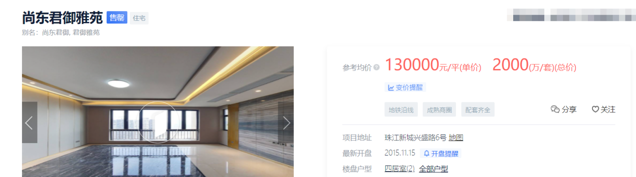 这样的总价,可以在广州核心城区购买下一套高端豪宅——位于天河区珠江新城兴盛路旁的尚东君御雅苑,180㎡-230㎡四房户型,售价约2千万/套,参考均价13万元/㎡。