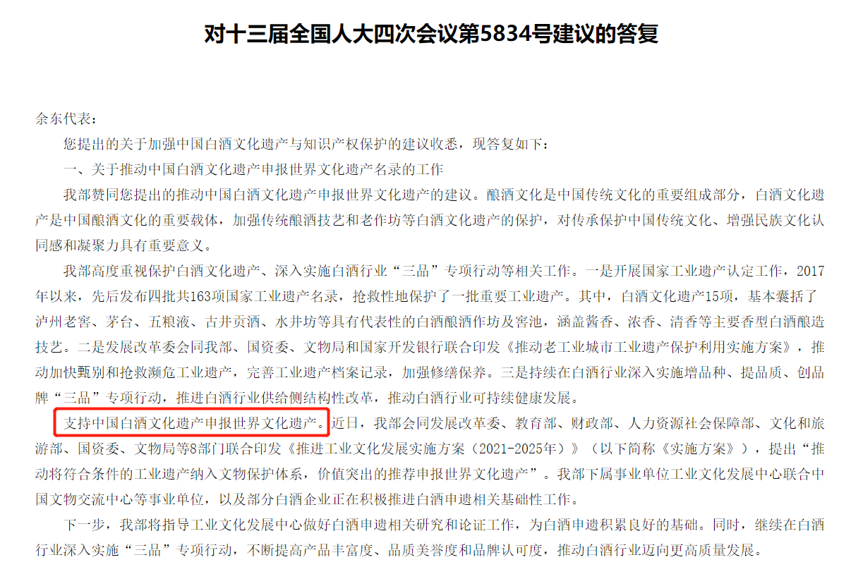 8月9日消息,工信部在《对十三届全国人大四次会议第5834号建议的答复》中指出,高度重视保护白酒文化遗产、深入实施白酒行业“三品”专项行动等相关工作。工信部表示,支持中国白酒文化遗产申报世界文化遗产。2017年以来,发布白酒文化遗产15项,基本囊括了泸州老窖、茅台、五粮液、古井贡酒、水井坊等具有代表性的白酒酿酒作坊及窖池,涵盖酱香、浓香、清香等主要香型白酒酿造技艺。