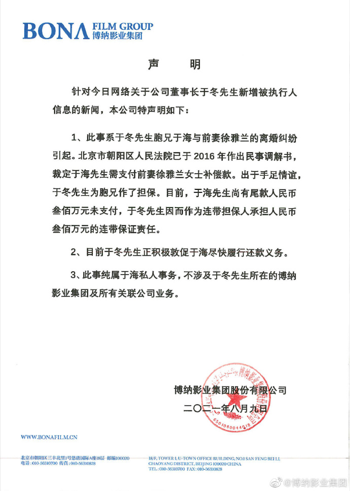 8月9日,博纳影业集团就董事长于冬被强制执行300万元发布声明称,此事系于冬胞兄于海与前妻徐雅兰的离婚纠纷引起。北京市朝阳区人民法院已于2016年作出民事调解书,裁定于海需支付前妻徐雅兰女士补偿款。出于手足情谊,于冬为胞兄作了担保。目前,于海尚有尾款人民币三百万元未支付,于冬因而作为连带担保人承担人民币三百万元的连带保证责任。于冬正积极敦促于海尽快履行还款义务。此事纯属于海私人事务,不涉及于冬所在的博纳影业集团及所有关联公司业务。